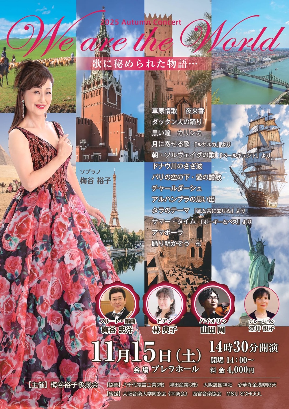 【概要】 梅谷裕子は大阪音楽大学・声楽科を卒業後にNHKに勤務しました。NHK『ニュースワイド640』のキャスターに就任、報道番組はもとより、料理番組、育児番組、音楽番組などの番組にてアナウンサーを担当した経験があります。1986年にビクターレコードよりソプラノ歌手としてデビューしました。クラッシック、ポピュラー、叙情歌(抒情歌)、童話、歌謡曲、軍歌、シャンソン、カンツォーなどを歌うという幅広いレパートリーで、各地でコンサートを開催したり、ディナーショーに出演しています。主に関西地区(大阪・兵庫・京都など)を中心に活動しています。2001年にはブルガリアで開催された『ソフィア音楽祭』にてソフィア・フィルハーモニーと共演、2006年には、ロシアのサンクト・ペテルブルクで行われた『日本人による文化&芸術の日』コンサートにてコングレス・オーケストラと共演、2008年にはウクライナのキエフにあるリーセンコホールにてウクライナ国立フィルハーモニーと共演して、活動の場を世界に広げています。これまでに『Vocalise Passionnee(ヴォカリーズ・パシオネ)』(2006年発表)、『甦れ!日本のこころ わが青春の軍歌』(2007年発表)、『 Con Amore 〜 うたは愛 〜 』(2013年発表)の3枚のCDを発表しています。 |